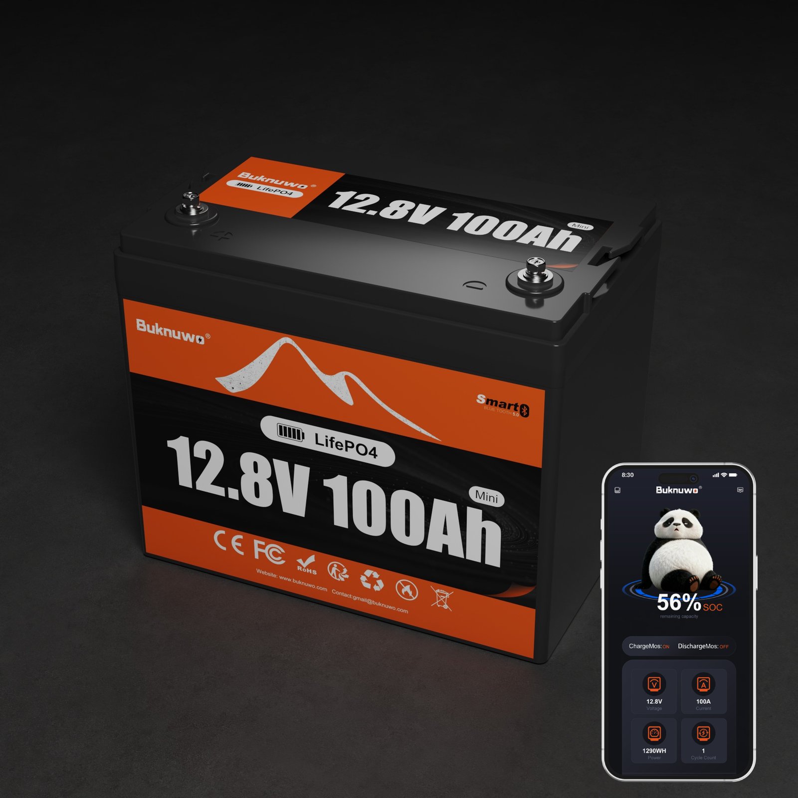 Buknuwo Smart 12.8V 100Ah Mini Bluetooth LiFePO4 Lithium Battery 1280Wh Power Energy with Low-Temp Protection