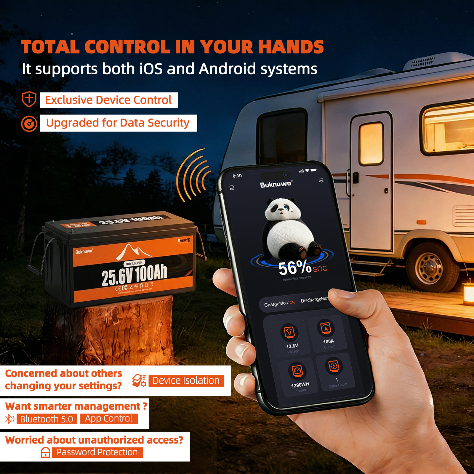 Smart BMS Protection:Built-in 100A/200A Smart BMS with auto-recovery againstovercharge, deep discharge, and thermal extremes.