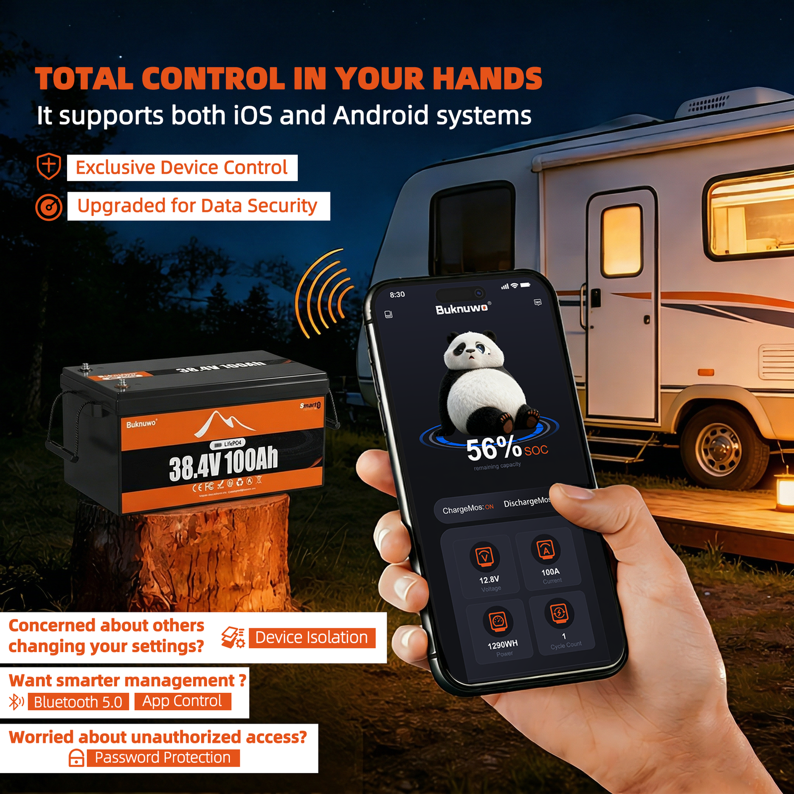 Smart 12V/12.8V 100Ah Bluetooth LiFePO4 Lithium Battery, 1280Wh Power Energy with Low-Temp Protection